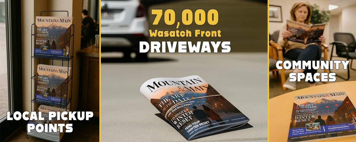 Every month, Mountain & Main lands on 70,000 driveways across Utah and Salt Lake counties. Another 10,000 copies reach readers at busy retail centers, coffee shops, restaurants, fitness studios, recreation venues, and business and medical offices — a combined monthly distribution of 80,000 across Utah's most desirable, high-growth communities.
